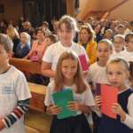 Dzieci z Duszpasterstwa „Boże Dzieciaki” rozdają zaproszenia dzieciom z parafii, aby zachęcić je do wstąpienia do duszpasterstwa.